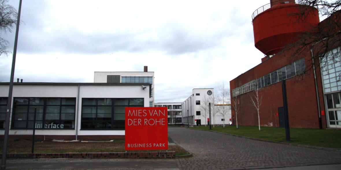 Schon der erste Blick zeigt die unverkennbare Handschrift Mies van der Rohes: Klare, geometrisch angeordnete Gebäude bilden diesen einzigartigen Campus. Im Kontrast dazu steht direkt an der Zufahrt ein imposantes Kesselhaus aus rotem Backstein. Mit seinem 30 Meter hohen Schornstein lässt es die schlichen Bauhaus-Kuben, Pförtnerhaus und den Komplex aus Uhrenturm, vierstöckigem Hauptgebäude und der lichtdurchfluteten Shed-Halle mit der namensgebenden schuppenförmigen Fensterdachkonstruktion fast modellhaft klein wirken. Der Industriepark wurde in den 1930er Jahren von Ludwig Mies van der Rohe errichtet und war lange Zeit in Besitz der Vereinigten Seidenwebereien AG.