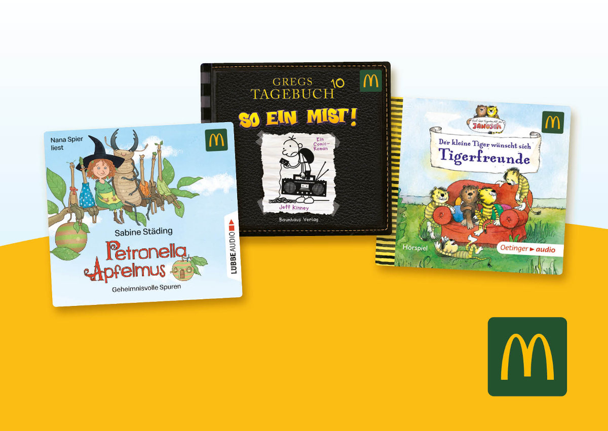 Egal ob im Auto, auf der Couch oder im Urlaub – Hörbücher und Hörspiele werden immer beliebter. Ab 15. April bietet McDonald's in allen teilnehmenden Restaurants drei beliebte Geschichten für Kids und Jugendliche an. Für jedes verkaufte Exemplar geht über ein Euro an die McDonald's Kinderhilfe Stiftung.