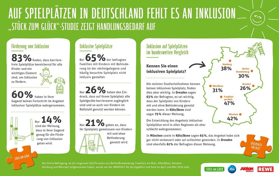 Spielplätze haben einen hohen Stellenwert in deutschen Familien. 75 Prozent der befragten Eltern besuchen mindestens einmal pro Woche mit ihren Kindern einen Spielplatz. Allerdings werden Kinder mit Behinderung auf öffentlichen Spielflächen häufig ausgegrenzt: Deutschlandweit kennen nur 36 Prozent aller Befragten einen Spielplatz, der inklusiv gestaltet ist und auf dem alle Kinder gemeinsam spielen können. In Deutschland besteht also ein hoher Handlungsbedarf, um mehr inklusive Spielräume zu schaffen. Mit „Stück zum Glück“ setzen sich deshalb Procter & Gamble (P&G) und Rewe gemeinsam mit der Aktion Mensch seit April 2018 für mehr inklusiven Spielraum in ganz Deutschland ein. Innerhalb der dreijährigen Initiative werden mehr als 30 Spielplätze mit einem Gesamtvolumen von einer Million Euro neu-, aus- und umgebaut.