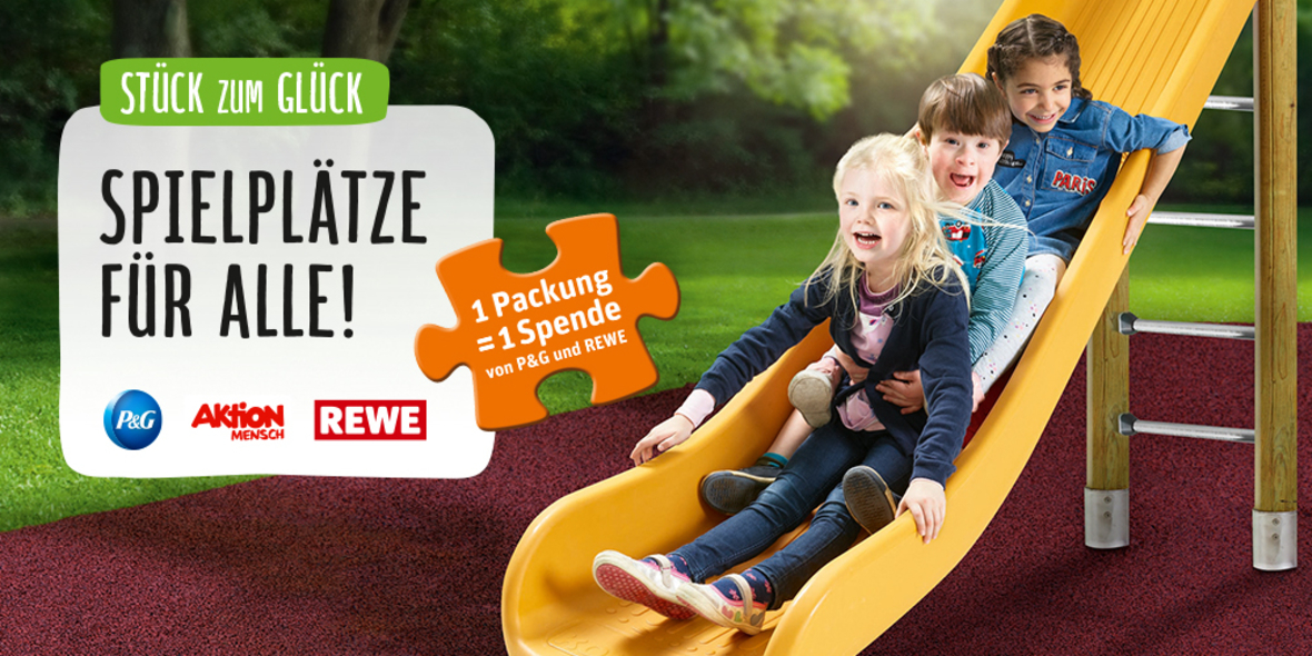 Mit „Stück zum Glück“ schaffen P&G und Rewe gemeinsam mit der Aktion Mensch seit April 2018 bundesweit inklusive Spielplätze. „Bisher haben wir schon 16 Spielplatzprojekte umgesetzt und weitere Projekte sind in Planung. Unser Ziel ist es, in ganz Deutschland inklusive Spielräume zu ermöglichen“, sagt Lionel Souque, Vorstandsvorsitzender der Rewe Group. Dabei kann jeder einen Beitrag zum Glück der Kinder leisten. Denn mit jedem Kauf eines Produkts aus dem Sortiment von P&G, zu dem Marken wie Pampers, Ariel, Always, Oral-B und Gillette gehören, können Rewe Kunden in ganz Deutschland das Projekt unterstützen. So werden über einen Zeitraum von drei Jahren eine Million Euro gesammelt, um deutschlandweit neue inklusive Spielplätze zu schaffen und bestehende Spielplätze für alle Kinder aus- oder umzubauen.