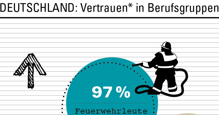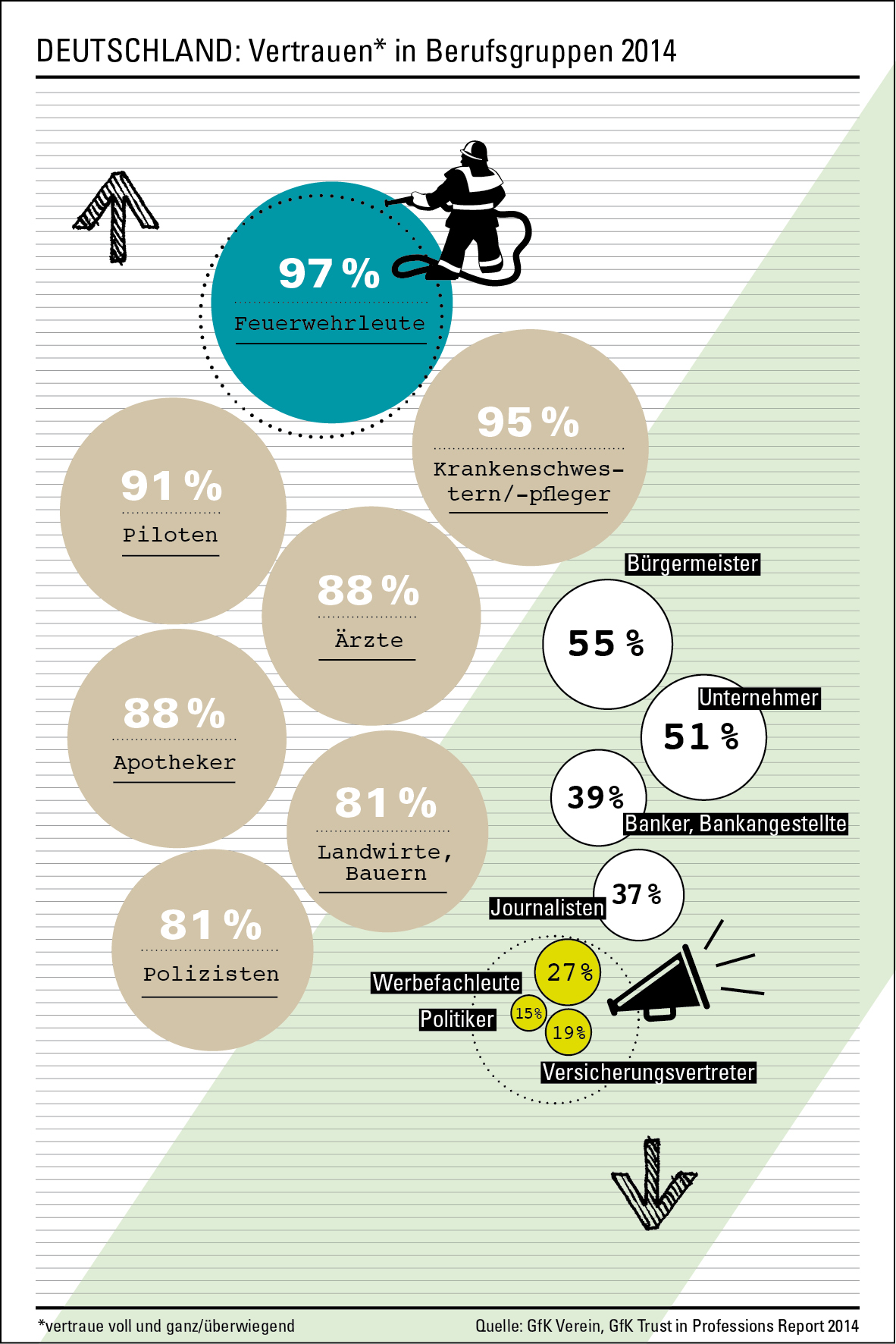 In 25 Ländern hat der GfK Verein Menschen gefragt, welchen Berufen sie vertrauen. Ganz oben stehen in 15 Ländern die Feuerwehrleute. Den geringsten Zuspruch erhalten in Deutschland und 22 weiteren Ländern die Politiker. Nur ihren Bürgermeister sehen viele Befragte offenbar mit anderen Augen, denn die Kommunalpolitiker schneiden deutlich besser ab. Helfende Berufe genießen das Vertrauen der Menschen: Auf allen Kontinenten belegen laut der Studie "GfK Trust in Professions 2014" Feuerwehrleute, Sanitäter, Pflegekräfte und Ärzte die vorderen Plätze.