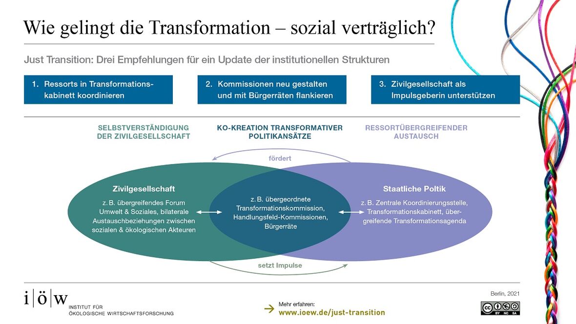 Dieses Transformationskabinett soll seine Entscheidungen nicht ‚top down‘ treffen, sondern Bürgerräte und Wissenschaftler*innen in die Entscheidungsvorbereitung mit einbeziehen sowie die vielfältigen Bottom-up-Aktivitäten stärken, insbesondere durch eine langfristige Förderung für die Zusammenarbeit von Gewerkschaften, Umwelt-, Sozial- und Wohlfahrtsverbänden. „Es braucht neue Strukturen, innerhalb derer die Selbstverständigung zwischen unterschiedlichen Akteuren langfristig verstetigt werden kann, etwa in einem ‚Forum Umwelt & Soziales‘. Auf diese Weise ist es möglich, Politikansätze gemeinschaftlich zu entwickeln“, so Petschow. „Diese Prozesse können wir nur gerecht gestalten, wenn die unterschiedlichen Interessen in die Entscheidungsvorbereitung eingebunden werden.“ An der Schnittstelle von Staat und Zivilgesellschaft sollten vermehrt Transformationskommissionen eingesetzt werden, um Strategien und Maßnahmen für einzelne Handlungsfelder zu erarbeiten. Anders als bei der Kohlekommission in 2018/19 müssen die Beteiligungsverfahren jedoch weg vom Kompromiss des kleinsten gemeinsamen Nenners hin zu zukunftsfähigen Lösungen kommen.