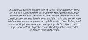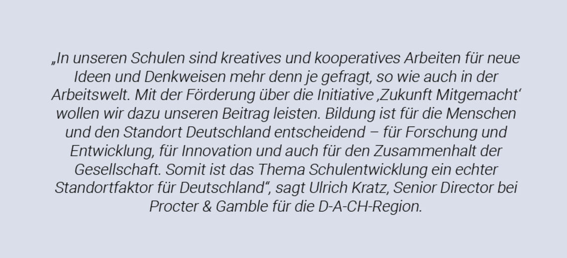 Bereits seit vielen Jahren setzen sich das Deutsche Kinderhilswerk, ROSSMANN und P&G gesellschaftlich für Familien und Kinder ein – seit 2021 unter dem gemeinsamen Dach „Zukunft Mitgemacht“. Ziel der Partner ist es, junge Menschen zu stärken und ihnen die Möglichkeit zu geben, selbstbestimmt zu lernen und die Gesellschaft aktiv mitzugestalten. Dabei stellen sie Schülerinnen und Schüler in den Mittelpunkt ihres Engagements. Neben Digitalisierung geht es bei „Zukunft Mitgemacht“ auch um Themen wie Nachhaltigkeit, Diversität oder die Förderung von MINT-Fächern (Mathematik, Informatik, Naturwissenschaften und Technik). In diesem Zusammenhang haben die Partner auch 2024 die Bildungsinitiative #wirfürschule unterstützt.