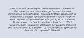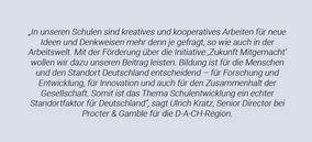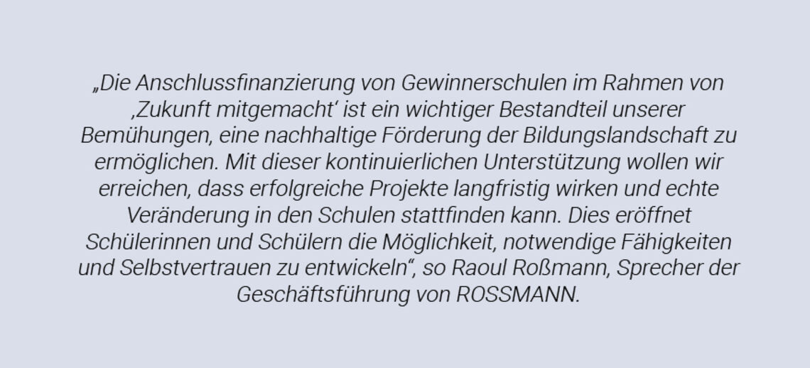 Insgesamt hatten sich in 2024 rund 300 Schulen aus ganz Deutschland um eine Förderung beworben und ihre Ideen eingereicht. „Dieses große Interesse der Schulen zeigt eindrücklich, wie wichtig das Feld der Schulentwicklung ist und dass hier eine Initiative ins Leben gerufen wurde, die in Schulen nachhaltige Veränderungen bewirken kann“, so die Projektpartner. Dabei freuten sie sich eigenen Angaben zu Folge insbesondere darüber, dass das jährliche Spendenziel von einer Million Euro 2024 übertroffen wurde. „Dies verdanken wir den Kunden, die das ganze Jahr über mit ihrem Kauf von P&G-Produkten bei ROSSMANN die Initiative unterstützt haben.“