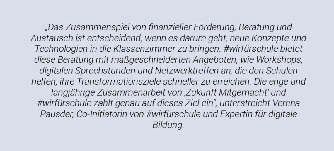 Die Schulen sind bei der Umsetzung ihrer Maker Spaces aber nicht allein, sondern werden von der Bildungsinitiative #wirfürschule unterstützt. „Diese hilft Schulen dabei, ihren Maker Space nachhaltig zu implementieren und effektiv zu nutzen. Dabei bietet die Initiative maßgeschneiderte Unterstützung, die auf einer individuellen Bedarfsanalyse basiert, um eine passgenaue Begleitung zu gewährleisten“, informieren die Projektpartner von „Zukunft Mitgemacht“ gemeinsam gegenüber der Presse.