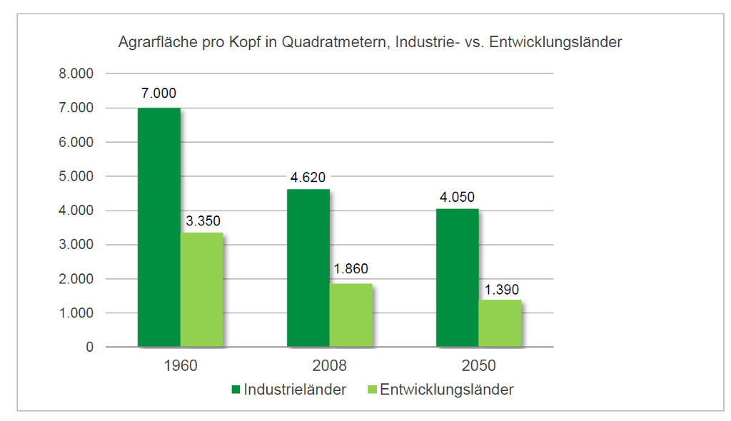 Doch aktuelle Entwicklungen geben allen Anlass zur Sorge: 24 Prozent der weltweiten Landesflächen sind von Degradierung betroffen, wobei jedes Jahr weitere 24 Milliarden Tonnen fruchtbarer Erde aufgrund von Erosion, Bebauung, Verdichtung und Ressourcenausbeutung verloren gehen. Diesem Trend stehen ein rapides Bevölkerungswachstum, steigender Wohlstand und sich verändernde Konsummuster, vor allem in Entwicklungs- und Schwellenländern, gegenüber, welche den Druck auf die verbleibenden Landressourcen weiter erhöhen. Seit 1960 hat sich die durchschnittliche Agrarfläche pro Kopf mehr als halbiert. Und bei prognostizierten 9 Milliarden Menschen bis 2050 und gar 13 Milliarden Menschen bis zum Ende des Jahrhunderts wird sich dieser Trend zweifellos verschärfen.