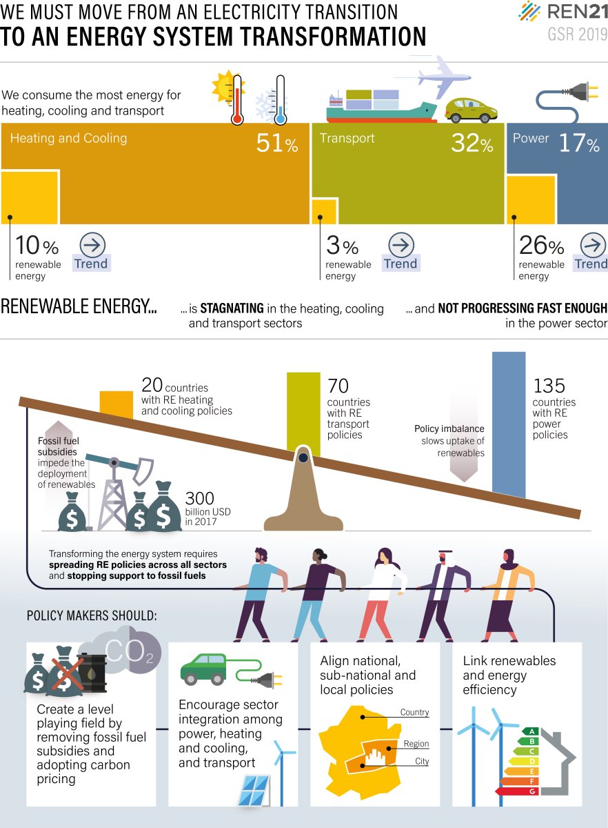 Es bestehen große Möglichkeiten für Länder, Maßnahmen voranzutreiben, indem sie die Energiewende auf die Bereiche Wärme und Kälte sowie Verkehr ausweiten. Erneuerbare Energien decken mehr als 26 Prozent der Stromerzeugung weltweit ab, aber lediglich zehn Prozent der im Bereich Wärme und Kälte genutzten Energie und nur etwas mehr als drei Prozent im Bereich Verkehr. Dieses Ungleichgewicht zwischen einzelnen Energiebereichen ist weitgehend auf unzureichende oder unbeständige politische Unterstützung zurückzuführen. Die Zahl der Länder mit einer Politik zugunsten erneuerbarer Energien im Wärmebereich hat sogar abgenommen.