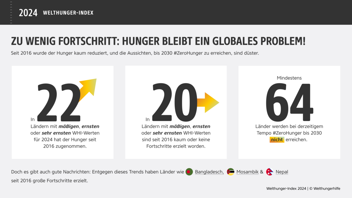 Der jüngste Welthunger-Index der Welthungerhilfe zeigt, dass die weltweiten Fortschritte im Kampf gegen den Hunger nahezu zum Stillstand gekommen sind. Trotz positiver Entwicklungen in einigen Regionen wurden seit 2016 nur minimale Fortschritte erzielt. Weltweit leiden immer noch 733 Millionen Menschen an Hunger. Die Analyse umfasst die Ernährungssituation in 136 Ländern. In 22 Ländern hat sich das Hungerproblem seit 2016 verschärft, in 20 Ländern stagnieren die Fortschritte weitgehend. Besonders betroffen sind Afrika südlich der Sahara und Südasien, die erneut die höchsten Hungerraten aufweisen. Komplexe Krisen wie bewaffnete Konflikte, die Folgen des Klimawandels und eine hohe Verschuldung verstärken sich gegenseitig und treffen vor allem die ärmsten Länder und Menschen. Verschärft wird die Situation durch fehlende Geschlechtergerechtigkeit: Frauen und Mädchen sind am stärksten von Hunger betroffen und leiden überproportional unter den Folgen des Klimawandels.