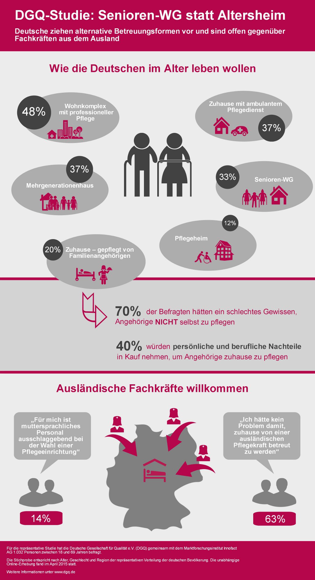 Deutsche ziehen alternative Betreuungsformen vor und stehen Fachkräften aus dem Ausland offen gegenüber - das zeigen die Ergebnisse einer repräsentativen Studie der Deutschen Gesellschaft für Qualität e.V. (DGQ) unter rund 1.000 Verbrauchern. Der Erhalt der Eigenständigkeit im Falle der Pflegebedürftigkeit ist den Deutschen sehr wichtig.