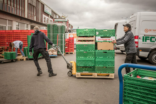Mitarbeiter der Tafel transportieren die Lebensmittel.