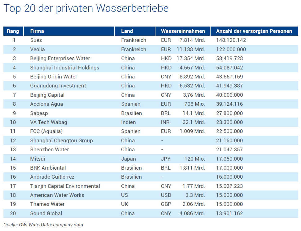 Erstens mit den Versorgern. Peter Hermann schreibt in einem Anleger- Blog: „So ist der Weltmarkt für das kühle Nass längst unter einigen wenigen Konzernen aufgeteilt: Neben den beiden großen französischen Konzernen Veolia und Suez gehören hierzu die US-amerikanischen Unternehmen Xylem und Lindsay.“ Beim Thema Wasser sind die Franzosen stark im Geschäft: Suez und Veolia beliefern 270 Millionen. Kunden weltweit und machen damit annähernd 20 Milliarden Euro Umsatz im Jahr.