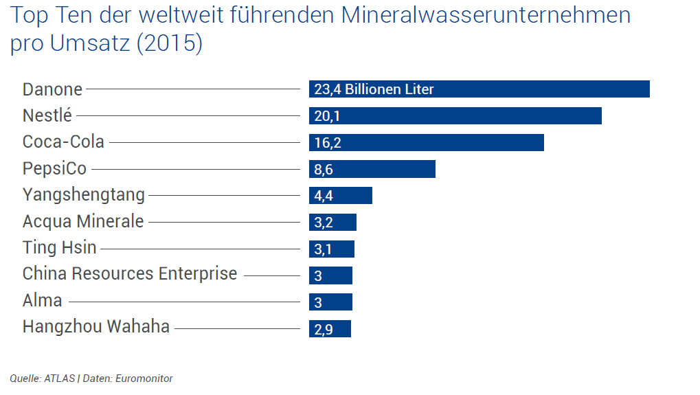 Der zweite große Gewinnbringer ist das Geschäft mit abgefülltem Wasser: Weltweit werden weit über 100 Milliarden Liter Wasser jährlich in Plastikflaschen abgefüllt. Vielleicht 20 Prozent von diesen werden später auch recycelt. Verdienen tun daran die bekannten großen Marken im Lebensmittelgeschäft: Nestlé, Danone, Coca-Cola machen schon den Großteil des Weltmarktes unter sich aus. Allein Nestlé erwirtschaftet mit seiner Wassersparte über sieben Milliarden Franken Jahresumsatz. In Deutschland werden Statistiken zufolge etwa 11,5 Milliarden Liter abgefülltes Wasser pro Jahr getrunken. Das entspricht 142 Litern pro Kopf. Damit ist Deutschland nach Mexiko, Thailand und Italien weltweit Spitze beim Verbrauch von abgepacktem Wasser. Davon profitiert auch der Handel: Das Getränkeliefer-Start-up Flaschenpost aus Münster hat unlängst 20 Millionen Euro von Investoren eingesammelt.