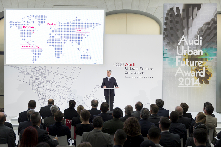 2010 ist die Audi Urban Future Initiative entstanden, die den internationalen Dialog mit Stadtplanern, Architekten und Mobilitätsexperten anstößt. Im Rahmen des Audi Urban Future Award 2014 haben jetzt vier interdisziplinäre Teams aus Berlin, Boston, Mexico City und Seoul neue Mobilitätsideen unter dem Motto "Auto findet Stadt" entwickelt und dabei städtebauliche, soziale und technologische Fragen berücksichtigt. Stadtplaner, Architekten, Datenexperten und Designer präsentierten in Berlin ihre Lösungen für aktuelle städteplanerische Projekte der Öffentlichkeit. Mit seiner "Urbanen Agenda" setzt Audi direkt auf die Erkenntnisse aus dem diesjährigen Wettbewerb auf.