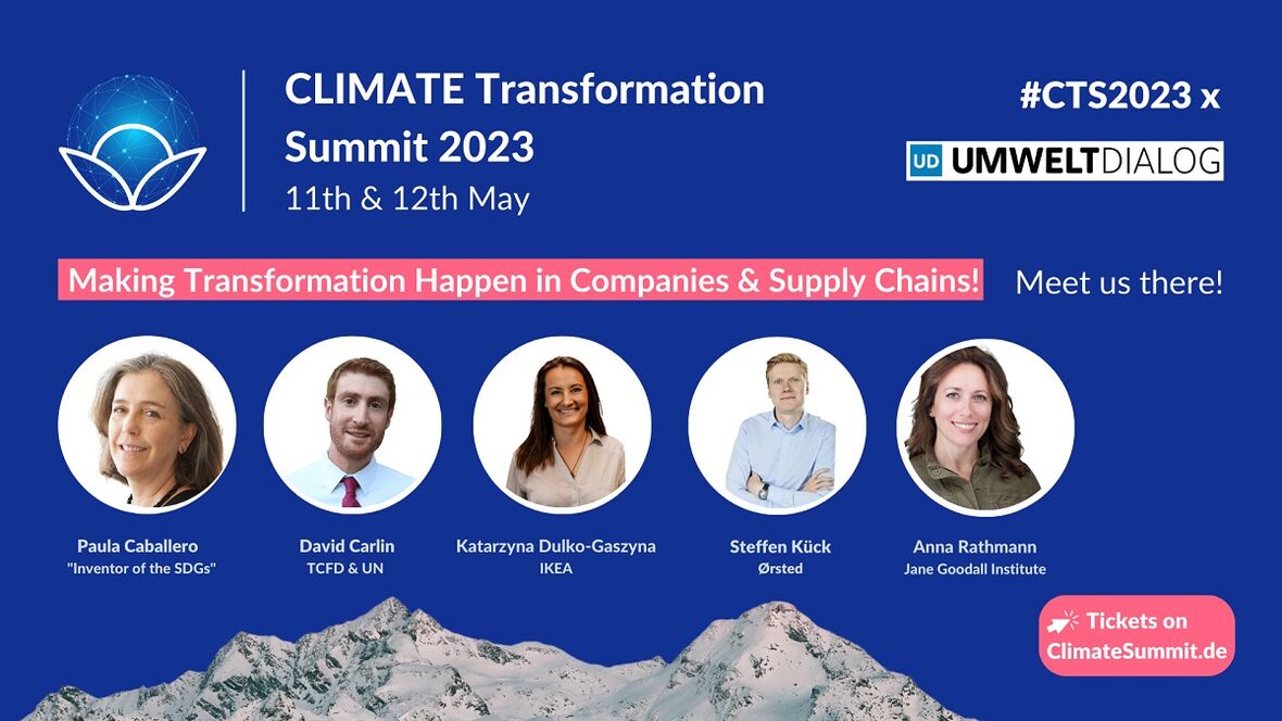 Der online Climate Transformation Summit 2023 (#CTS2023) fördert am 11. und 12. Mai 2023 den branchenübergreifenden Wissenstransfer zur Scope-3-Reduktion. Internationale Klimaexpert:innen wie Paula Caballero, die „Erfinderin der SDGs“, David Carlin (TCFD), Daniel Mazure (UN Global Compact), Anna Rathmann (Jane Goodall Institute) und Sonja Bhonsle (Carbon Disclosure Project) teilen ihr Fachwissen und treffen dabei auf Expert:innen aus der Praxis unter anderem von IKEA, Ericsson, Orange, Danone, Ørsted und der Deutschen Bahn.