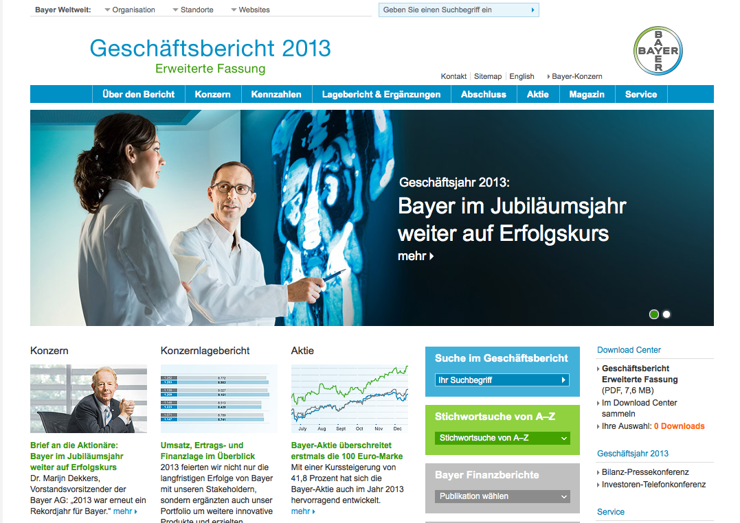Die guten Zahlen der einzelnen Sparten schlagen sich auch im Gesamtergebnis der Bayer AG wieder. Der Konzern, der 2013 sein 150jähriges Bestehen feierte, kann dabei auf eine erfolgreiche Bilanz verweisen: Insgesamt stieg der Gesamtumsatz des Unternehmens von 39,7 Milliarden in 2012 auf 40,1 Milliarden Euro in 2013. Der weitaus umfangreichere Teil des Geschäftsberichtes erläutert im Anschluss an die Best Practice Beispiele die ökonomischen Dimension von Bayers Entwicklung.
