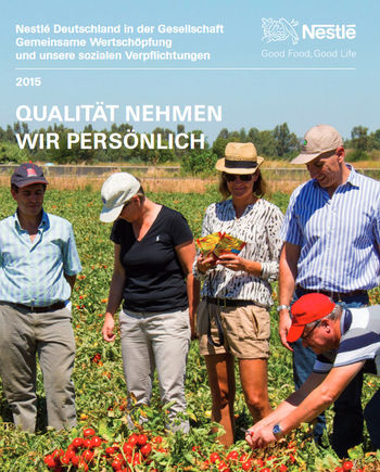 Die Nestlé Deutschland AG hat ihren Bericht zur Gemeinsamen Wertschöpfung 2015 Mitte Juni 2016 veröffentlicht. Der Fortschrittsbericht zur unternehmerischen Verantwortung steht unter dem Titel „Qualität nehmen wir persönlich“ und dokumentiert auf rund 70 Seiten Entwicklungen des Unternehmens in den Handlungsfeldern Ernährung, Beschaffung, Umwelt, Mitarbeiter und Produktsicherheit. Die Inhalte entsprechen dem Berichtsstandard GRI 4 der Global Reporting Initiative und flankieren den internationalen Bericht des Konzerns, der sich über rund 350 Seiten erstreckt.