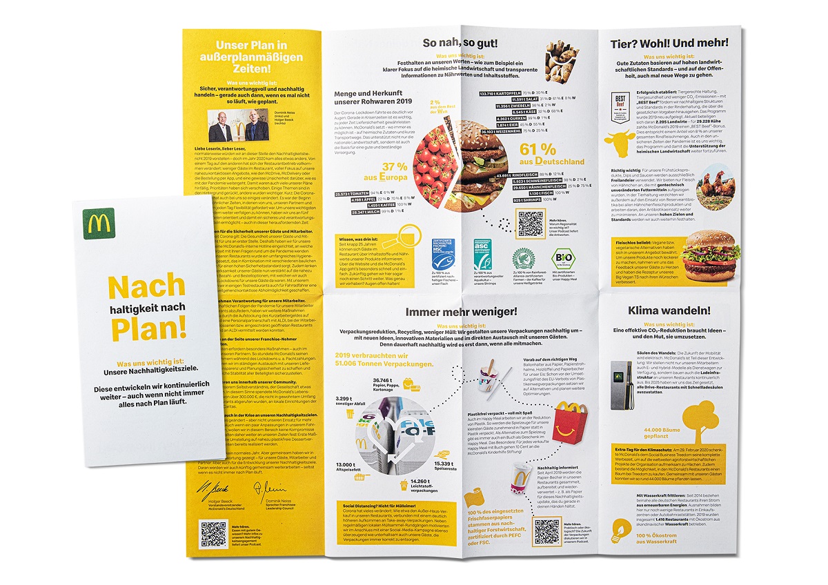 Anstatt eines Nachhaltigkeitsberichtes hat McDonald’s Deutschland dieses Jahr ein Nachhaltigkeitsupdate mit dem Titel „Nachhaltigkeit nach Plan“ veröffentlicht. Begleitet wird dies von einer ausführlichen Web-Version. Die Angaben und Zahlen in dem Update stammen, sofern nicht anders angegeben, aus dem Geschäftsjahr 2019. Sie beziehen sich auf alle Restaurants, die McDonald’s Deutschland selbst betreibt, und auf die Restaurants in Deutschland und Luxemburg, die von Franchise-Nehmern betrieben werden. Neben dem Nachhaltigkeitsupdate hat McDonald’s außerdem eine Podcast-Reihe gestartet, die sich mit der Gastronomie der Zukunft beschäftigt.
