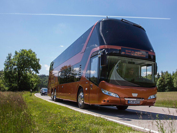 Der Doppeldecker-Reisebus zeigt mit bis zu 83 Sitzplätzen, dass sich Fahrkomfort mit hervorragender Wirtschaftlichkeit verbinden lässt. In aufwändigen Simulationen sowie im Windkanal wurde eine konkurrenzlose Aerodynamik der Skyliner-Karosserie erreicht. Sie hat einen Luftwiderstandsbeiwert (cW) von lediglich 0,41 – ein für Reise-Doppeldecker bislang unerreichter Bestwert. Die ausgezeichnete Aerodynamik des NEOPLAN Skyliner zahlt sich für den Betreiber durch Kraftstoffverbrauch von unter 30 Liter Diesel je 100 Kilometer aus, während die Reisenden von den weiter reduzierten Fahrtwindgeräuschen profitieren. Resultat der Aerodynamikoptimierungen ist ein rechnerischer Minderverbrauch von rund fünf Prozent bei konstanter Autobahnfahrt mit 100 km/h. Für die Umwelt bedeutet das einen der niedrigsten CO2-Emissionswerte von minimal zwölf Gramm pro Personenkilometer, die aktuell kein anderes marktgängiges Verkehrsmittel erreicht.