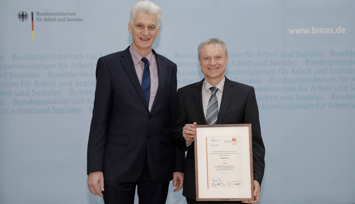 Ende Februar sind im Bundesministerium für Arbeit und Soziales in Berlin deutsche Unternehmen für die beste Transparenz zum Thema Nachhaltigkeit ausgezeichnet worden. Der Nachhaltigkeitsbericht 2017/18 der memo AG belegt im Ranking der Nachhaltigkeitsberichte 2018 des IÖW und Future den dritten Platz in der Kategorie Mittelstand.