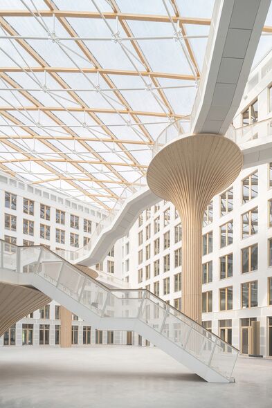 Hauptattraktion ist das Atrium des Carré-Gebäudes: Dominiert wird es von vier unterschiedlich hohen baumförmigen Stützen.