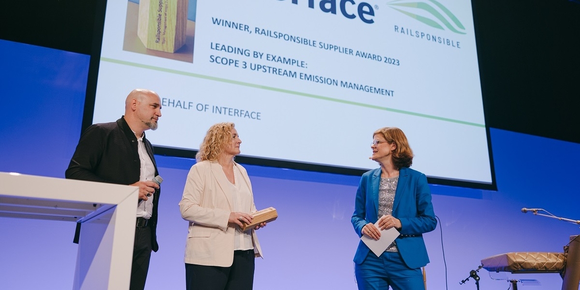 Der Hersteller modularer Bodenbeläge ist von unabhängiger Stelle als klimaneutral gemäß dem anerkannten Standard PAS 2060 zertifiziert und ist das erste Unternehmen in der Bodenbelagsindustrie, das Klimaneutralität über alle Bereiche hinweg (Scope 1 bis 3) erreicht hat. Bisher unvermeidbare Emissionen gleicht Interface freiwillig aus und erwirbt Emissionsminderungszertifikate für Klimaschutzprojekte. Seine Pionierrolle beim Thema Klimaschutz würdigt Railsponsible mit dem Supplier Award, der jedes Jahr herausragende Leistungen eines Zulieferers hinsichtlich der Nachhaltigkeit in den Vordergrund rückt.