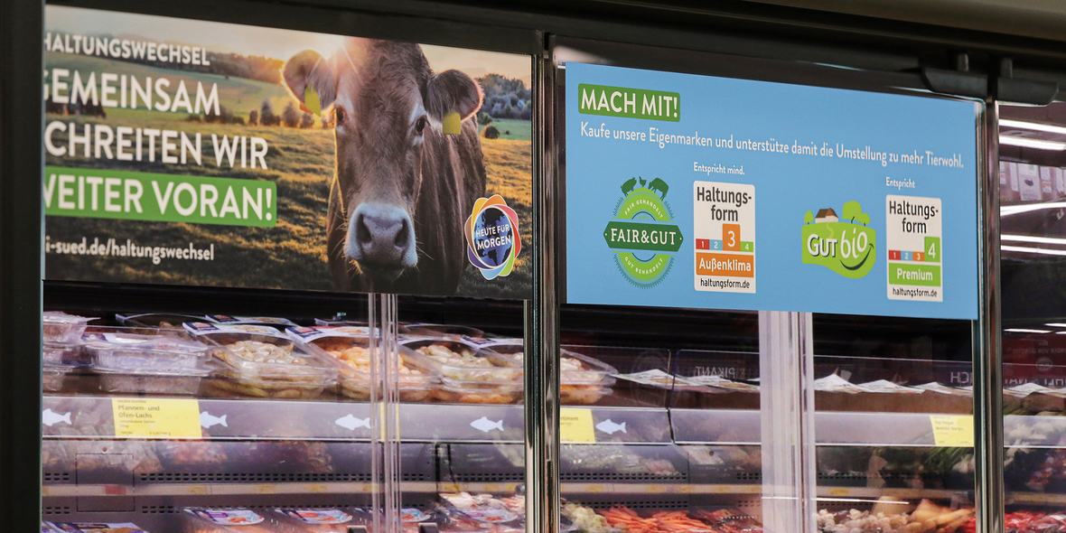 ALDI SÜD bezieht seine Trinkmilch bereits zu 100 Prozent aus tierfreundlicherer Haltung und ausschließlich aus Deutschland. Auch 100 Prozent des Puten- und Rindfrischfleisches sind inzwischen auf diese höheren Haltungsformen umgestellt. Insgesamt stammen bei ALDI SÜD 50 Prozent des Frischfleisches aus tiergerechterer Haltung, bei den gekühlten Fleisch- und Wurstwaren sind es über 20 Prozent. Bis 2030 plant ALDI SÜD, das gesamte Frischfleischsortiment sowie die gekühlten Fleisch- und Wurstwaren auf tiergerechtere Haltungsformen umzustellen.