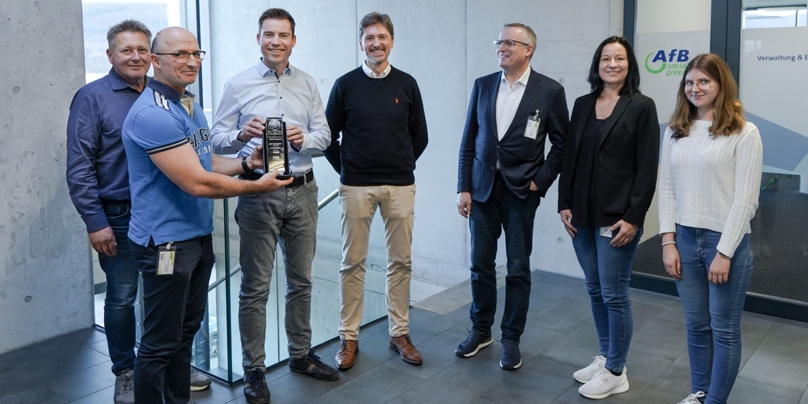 Nachdem die Besichtigung abgeschlossen war, überreichte Christian Rauch im Namen von Bertelsmann den Eco Innovation Award an Daniel Büchle, den Geschäftsführer der AfB. Diese firmeninterne Ehrung wird verliehen, um das ökologische und soziale Engagement von strategischen IT-Zulieferern des Konzerns zu würdigen.
