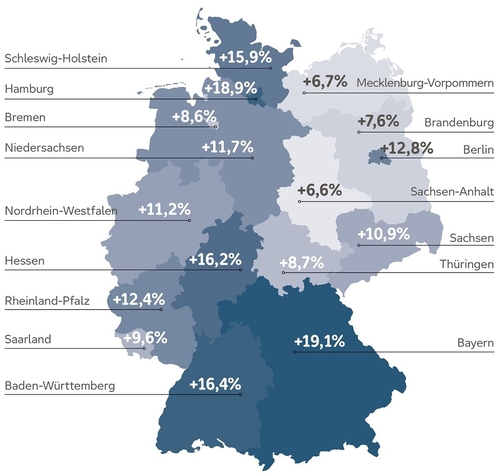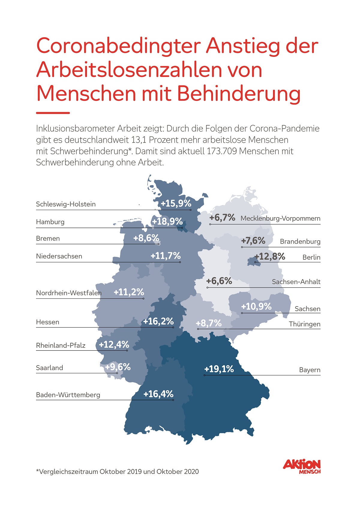 Von der negativen Arbeitsmarktentwicklung infolge der Corona-Pandemie sind durchweg alle Bundesländer in Deutschland betroffen. Den höchsten Anstieg an arbeitslosen Menschen mit Behinderung verzeichnen jedoch Bayern mit 19,1 Prozent und Hamburg mit 18,9 Prozent. Auch in Baden-Württemberg und Hessen sind die Werte mit 16,4 und 16,2 Prozent im bundesweiten Vergleich besonders hoch (Vergleichszeitraum Oktober 2019 und 2020). Hier zeigt sich der Studie nach eine Überlagerung der coronabedingten Konjunkturkrise mit der ohnehin anhaltenden Strukturkrise, die beispielsweise in der Automobil- und Automobilzulieferungsindustrie deutlich spürbar ist. Regionen wie Hamburg sind dagegen stark vom Tourismus geprägt und verzeichnen deshalb in der aktuellen Krise einen großen Verlust von Arbeitsplätzen, von dem auch viele Menschen mit Behinderung betroffen sind.