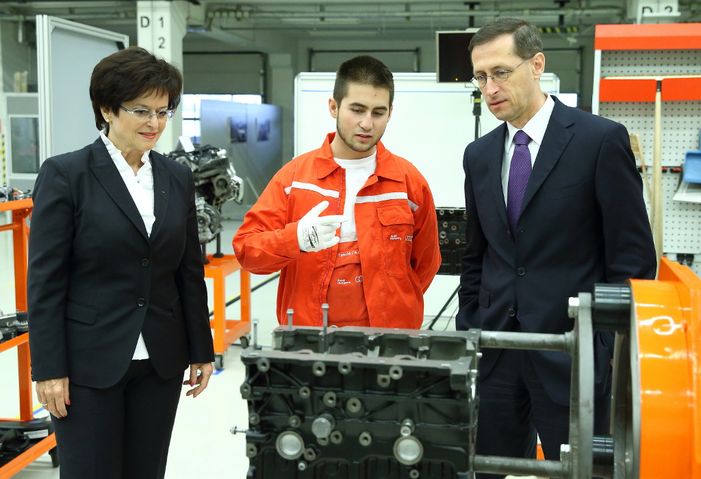 In Ungarn fördert Audi die duale Ausbildung seit 2001. Bis jetzt konnten auf diese Weise über 1.400 Auszubildende ihren Abschluss machen. Aktuell bildet das Unternehmen dort 250 Auszubildende in elf verschiedenen Metall- und Elektroberufen aus. Dazu steht ihnen auch das sogenannte Projekt- und Trainingscenter zur Verfügung, in dem Azubis und Mitarbeiter von 13 Trainern in den Bildungsbereichen Fahrzeug-, Karosserie-, Lack-, Mechatronik- und Fertigungsprozesstechnik geschult werden.