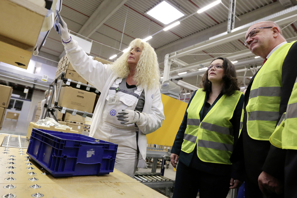 Bundesarbeitsministerin Andrea Nahles hat das Logistikzentrum von Volkswagen in Wolfsburg an der Westrampe besucht. Dr. Horst Neumann, Personalvorstand der Volkswagen Aktiengesellschaft, Bernd Osterloh, Vorsitzender des Volkswagen Konzernbetriebsrats, Thomas Ulbrich, Mitglied des Markenvorstands Volkswagen für den Bereich Produktion und Logistik, und Thomas Zernechel, Leiter Volkswagen Konzernlogistik, informierten die Ministerin und Wolfsburgs Oberbürgermeister Klaus Mohrs über die Einbindung leistungsgewandelter Mitarbeiterinnen und Mitarbeiter in den Arbeitsalltag sowie über effiziente Logistik.