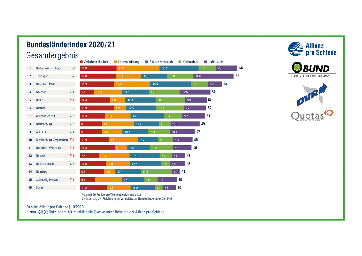 Die 16 Bundesländer liegen laut einer wissenschaftlichen Studie bei der Nachhaltigkeit im Verkehr weit auseinander. Das ermittelte das Forschungsinstitut Quotas im Auftrag von Allianz pro Schiene, dem Bund für Umwelt und Naturschutz Deutschland (BUND) und dem Deutschen Verkehrssicherheitsrat (DVR).