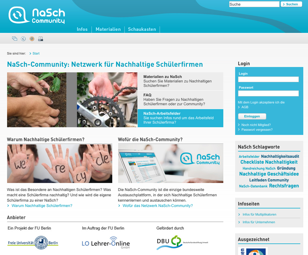 Die NaSch-Community ist ein Online-Angebot der Freien Universität Berlin in Zusammenarbeit mit der LO Lehrer-Online GmbH und wird durch die Deutsche Bundesstiftung Umwelt (DBU) finanziell unterstützt. Ziel des Projekts ist es, die Kommunikation aller Akteure in Nachhaltigen Schülerfirmen zu fördern und den Kreis der an Nachhaltigen Schülerfirmen Interessierten zu erweitern.