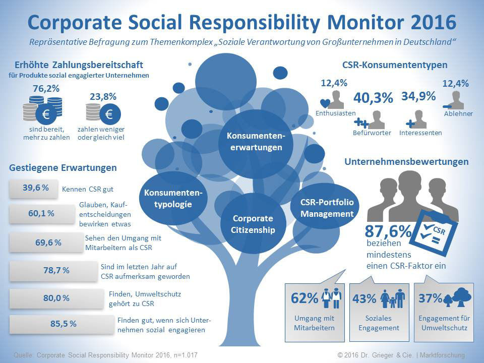 Das Marktforschungsinstitut Dr. Grieger & Cie. hat im April 2016 im Rahmen einer repräsentativen Umfrage 1.017 Verbraucher zwischen 18 und 69 Jahren zu verantwortungsvollem Unternehmertum und Corporate Social Responsibility (CSR) online befragt. Dabei wurden unterschiedliche Aspekte wie Erwartungen von Verbrauchern an CSR-Aktivitäten von Unternehmen sowie die Auswirkungen solcher Maßnahmen auf das Kaufverhalten untersucht. Die Studie identifiziert unterschiedliche Konsumententypen, denen Unternehmen mit einem passenden CSR-Portfolio begegnen müssen, um Glaubwürdigkeit und Unternehmenserfolg beeinflussen zu können.