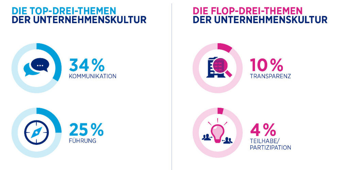 Neben der Kommunikation (34 Prozent) gelten Führung, Flexibilität und Veränderungsbereitschaft für jeweils 25 Prozent der befragten Entscheider als die weiteren zentralen kulturellen Handlungsfelder. Dagegen sprechen die Befragten den breit diskutierten Themen Transparenz, Partizipation und Vielfalt nur eine geringe Bedeutung zu.