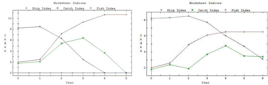 Die beiden folgenden Grafiken zeigen ein durchaus repräsentatives Bild der Spielverläufe. Der erste Versuch (linkes Diagramm) zeigt ein Scheitern, also die totale Überfischung aller Fanggebiete, nach fünf Jahren (= Spielrunden). Das Geschehen war hier getrieben von einem der sechs Teams, das sehr expansiv auftrat, seine Flotte rasch vergrößerte und das Geschehen beherrschte. Nur in zwei der Teams, die aus jeweils vier bis fünf Mitgliedern bestanden, machte man sich die Mühe, aufgrund der Daten der jeweiligen Fangjahre Berechnungen anzustellen, um die Entwicklung der Erträge pro Schiff zu berechnen. Bezeichnenderweise waren dies Teams, in denen nicht die Männer den Ton angaben, sondern mehrere Frauen waren. Allerdings trauten diese sich nicht, ihre Erkenntnisse in „Politik“ umzusetzen. Sie zogen zwar für ihr eigenes Unternehmen die richtigen Schlüsse, aber ließen die anderen Firmen mit ihrer expansiven und stark kompetitiven Strategie gewähren.