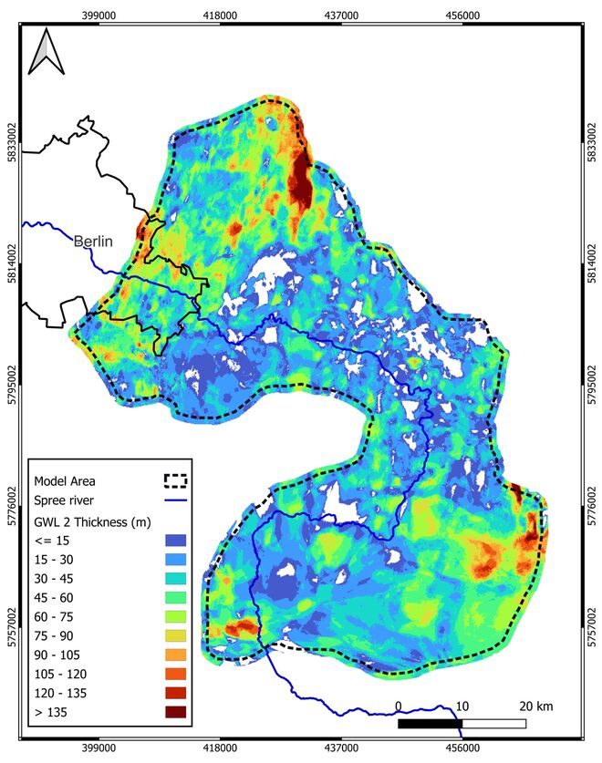 Um die Standorte für die Infiltrationsbrunnen zur künstlichen Grundwasseranreicherung in der Tiefe bestimmen zu können, haben die TU-Hydrogeologen zuvor ein dreidimensionales geologisches und hydrogeologisches Modell mit Methoden des Maschinellen Lernens erstellt. Das Modell gibt unter anderem Auskunft über die geologische Beschaffenheit des Untergrundes, die Tiefenlage und Mächtigkeit der Grundwasser führenden Schichten. Das Modell wird später den Behörden und Wasserversorgern für ihre wasserwirtschaftlichen Planungen zur Verfügung gestellt.