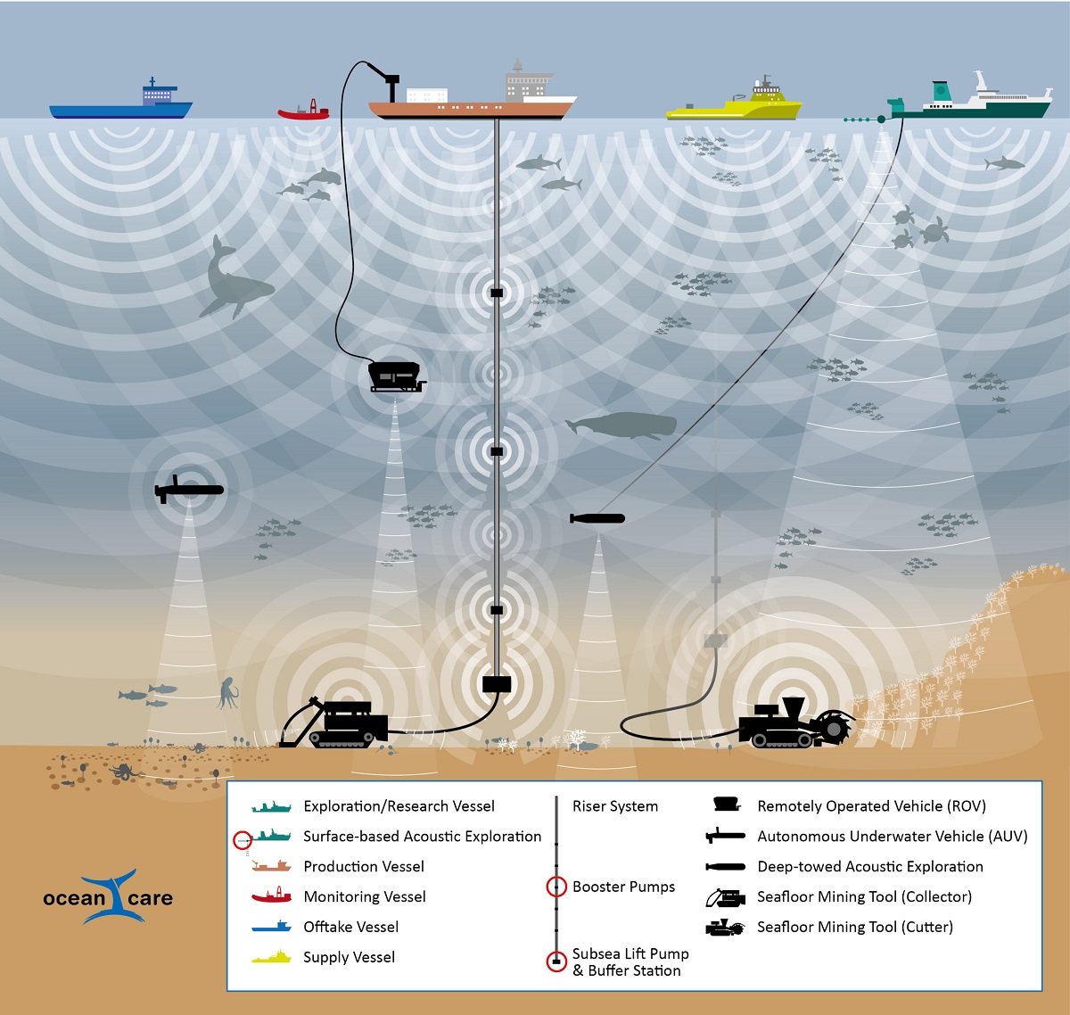 Unterwasserlärm wird in allen Phasen des Tiefseebergbaus erzeugt. Die beiliegende Darstellung zeigt die wichtigsten Quellen, von denen einige nur vorübergehend auftreten, während andere über Jahre bis zu Jahrzehnten hinweg nahezu konstant sind.