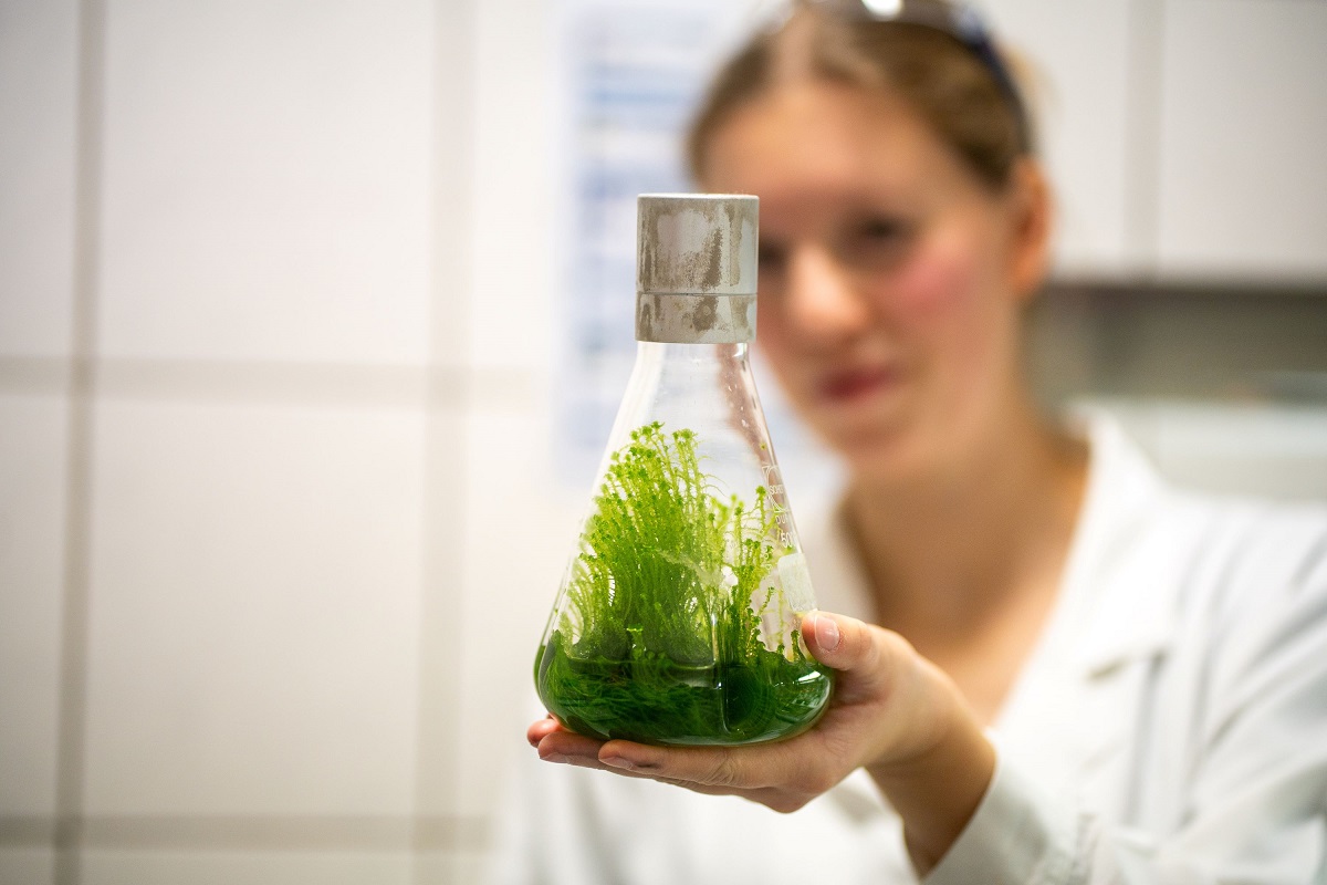Maria Glaubitz hält einen Glasbehälter mit einer flüssigen Substanz in ihrer Hand. Darin ranken sich ein paar Gramm einer Moospflanze zum Flaschenhals hoch. „Davon sollen zukünftig mehrere Kilogramm täglich kostengünstig und an nahezu jedem Ort produziert werden können. Unsere Aufgabe ist es, den Bioreaktor dafür zu entwickeln“, erklärt die Doktorandin des Promotionszentrums „Life Sciences“ an der Hochschule Anhalt. Seit Januar 2023 arbeitet sie im Projekt MOOSStart mit Unterstützung des Bundesministeriums für Ernährung und Landwirtschaft an der Erforschung von Torfmoos-Saatgut.