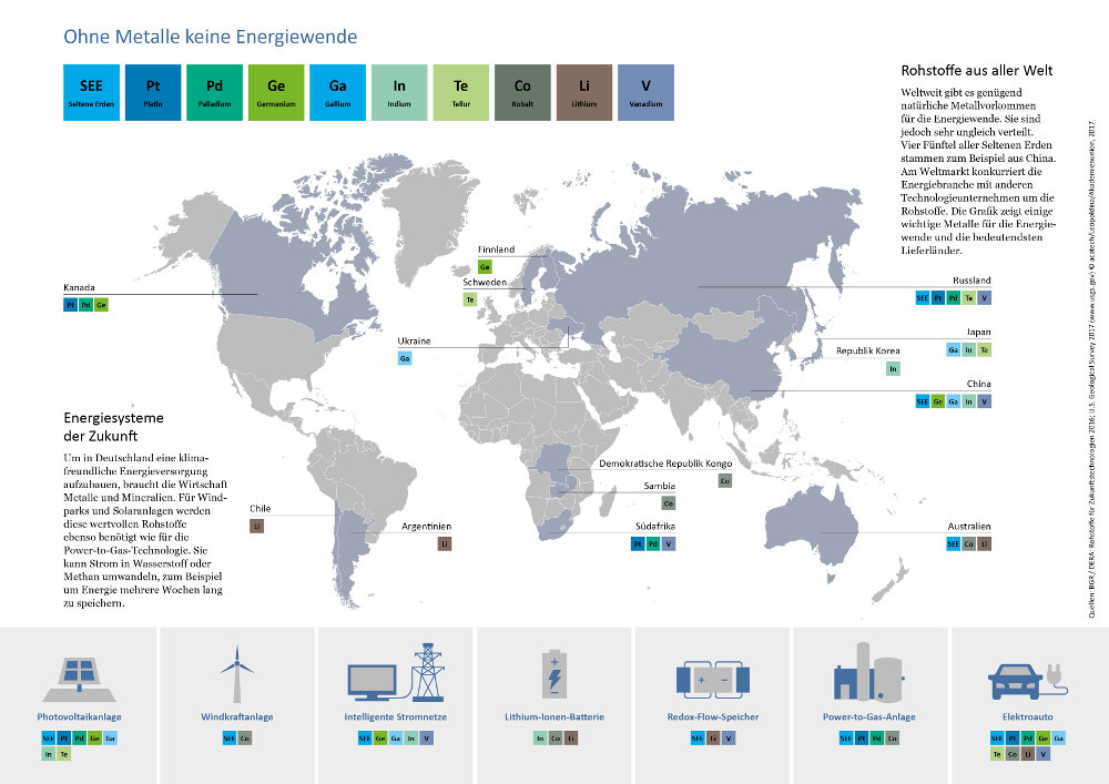 Ist die Energiewende erfolgreich, sinkt der Verbrauch von Kohle, Erdöl und Erdgas. Gleichzeitig müssen für den Ausbau von Windparks, Solaranlagen, Speichern und intelligenten Netzen immer mehr verschiedene Metalle importiert werden. Gefragt sind vor allem wertvolle Elemente wie Seltene Erden, Platingruppenelemente, Germanium, Indium und Kobalt. Von den Energierohstoffen werden besonders Erdgas und Biomasse benötigt, um die Schwankungen der Wind- und Solarenergie auszugleichen. Wie Deutschland unabhängiger von Rohstoffimporten werden kann, beschreibt die Stellungnahme „Rohstoffe für die Energiewende. Wege zu einer sicheren und nachhaltigen Versorgung“.