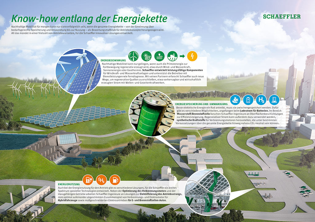 Die Betrachtung der gesamten Energiekette zeigt: Für die Mobilität von morgen gibt es nicht die eine Lösung. Schaeffler entwickelt deswegen für die verschiedenen Anforderungen eine Vielzahl an Systemen und Komponenten. Neben der weiteren Optimierung des klassischen Verbrennungsmotors und der dazugehörigen Getriebe arbeiten die Schaeffler-Ingenieure an Lösungen zur Elektrifizierung des Antriebstranges, dem optimal aufeinander abgestimmten Zusammenspiel von Verbrennungs- und Elektromotor für Hybridfahrzeuge sowie maßgeschneiderten, effizienten Elektroantrieben für E-Fahrzeuge.