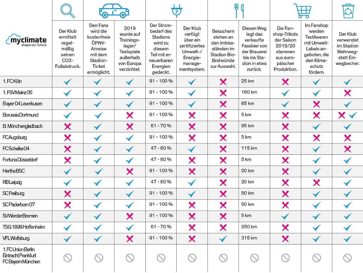 15 Bundesligaklubs haben an der Umfrage teilgenommen. „Der Fokus unserer Erhebung lag gezielt auf den Themen, die in der Ökobilanz eines Profifußballvereins am stärksten ins Gewicht fallen. Also Mobilität, Energie, Catering, Merchandising und Abfall. Daneben haben wir abgefragt, ob die Klubs regelmäßig eine CO2-Bilanz durchführen. Die Antworten haben wir in einer Grafik zusammengefasst“, erklärt Stefan Baumeister, Geschäftsführer von myclimate Deutschland.