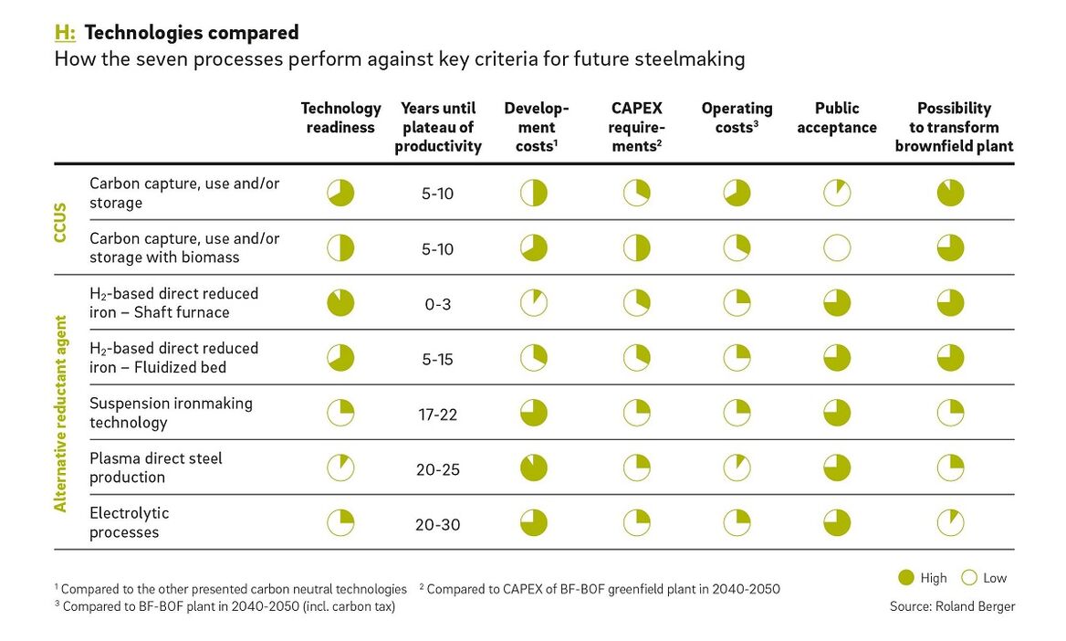 Für die Stahlindustrie ist die Frage nach der richtigen technologischen Lösung für eine umfassende CO2-Reduktion noch nicht abschließend beantwortet. So könnte der CO2-Ausstoß durch eine Kombination von CO2-Speicherung und teilweisem Einsatz von Biomasse im Hochofen zwar reduziert, allerdings nicht auf null gesenkt werden. Andere Optionen wie die Plasma-Direktstahlerzeugung oder die elektrolytische Reduktionsverfahren befinden sich in einem sehr frühen Entwicklungsstand. Das bringt große Unsicherheiten für einen industriellen Einsatz mit sich. „Wir haben verschiedene Verfahren auf ihre technologische Verfügbarkeit, Realisierbarkeit in Großanlagen sowie die wirtschaftliche Tragfähigkeit hin untersucht“, sagt Bernhard Langefeld, Partner von Roland Berger. „Wasserstoffbasierte Direktreduktion ist unserer Ansicht nach am weitesten entwickelt und - sobald es denn genügend grüne Energie gibt - für das Klima am sinnvollsten.“