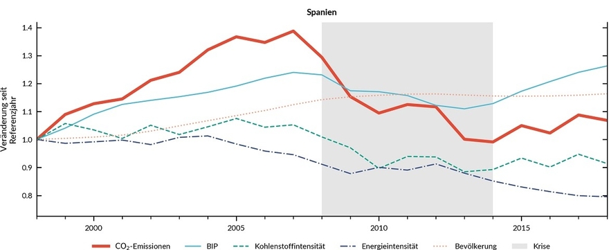 Veränderungen in der Wirtschaftsstruktur umfassen einen Rückgang der CO2-intensiven Industrien und einen Aufschwung für weniger energieintensive Industrien nach der Krise. Diese Veränderung wird durch wirtschaftliche und manchmal auch politische Kräfte angetrieben. Wenn sich die Wirtschaft erholt, setzen Unternehmen verstärkt auf weniger energie- oder kohlenstoffintensive Anlagen. Es ist aber auch eine Verschiebung vom Waren produzierenden zum Dienstleistungssektor zu verzeichnen. Bersalli führt Spanien als eindrucksvolles Beispiel für dieses Phänomen an: „In Spanien, das während der globalen Finanzkrise und der darauf folgenden Eurokrise zu den am stärksten betroffenen Ländern gehörte, litt die Industrie besonders stark. Ihr Anteil am BIP fiel von 26 Prozent im Jahr 2007 auf 20 Prozent im Jahr 2015. Die Bauindustrie brach zusammen und erreichte nie wieder auf das Vorkrisenniveau. Die spanische Rückkehr zum Wachstum fand in anderen, weniger kohlenstoff- und energieintensiven Sektoren statt.“