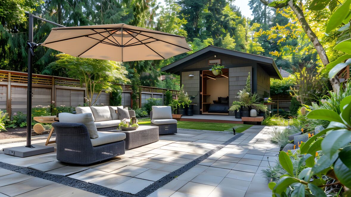Nordterrassen bieten durch ihre schattige Lage einen kühlen Rückzugsort. Mit der Ergänzung von schattenliebenden Pflanzen wie Efeu und Farnen wird eine grüne Oase geschaffen.