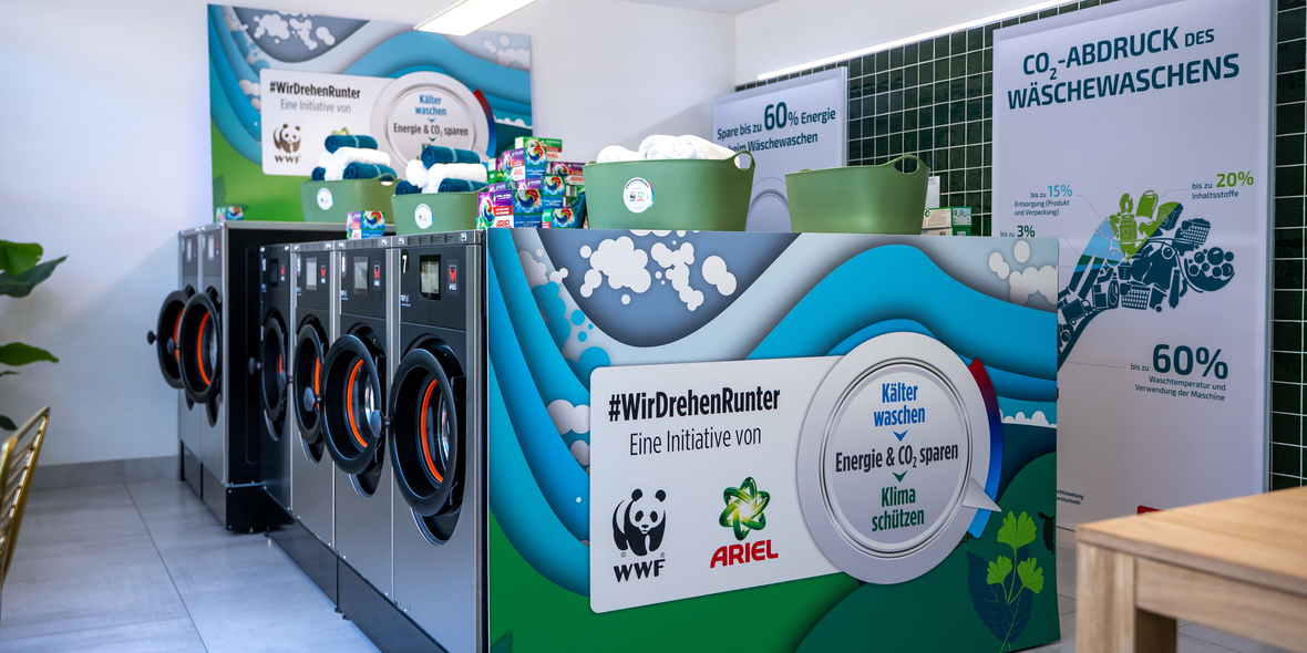 Wäsche bei 30 Grad Celsius waschen und dabei Energie, CO2 und Geld sparen – das ist das Ziel der Kampagne #WirDrehenRunter von WWF und P&G. In Pop-up-Kaltwaschsalons zeigen sie in München, Berlin und Köln, wie effektiv Kaltwaschen ist. Die Initiative wirkt: Bereits über 115.000 Tonnen CO2 wurden eingespart. Ein kleiner Dreh mit großer Wirkung für Klima und Umwelt.