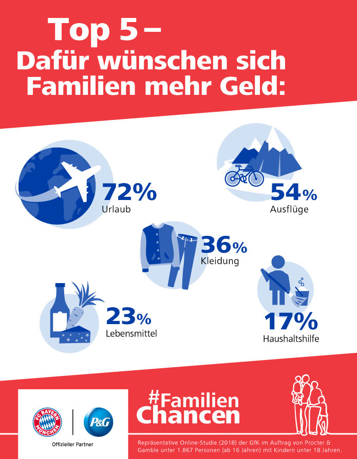 Gespart wird in deutschen Familien vor allem für Urlaube, Ausflüge und Kleidung – das hat eine aktuelle GfK-Studie im Auftrag von Procter & Gamble ergeben. Für Familien mit niedrigen Einkommen ist es nahezu unmöglich geworden, Rücklagen zu bilden. Die Aktion #FamilienChancen, die P&G mit Unterstützung des FC Bayern München ins Leben gerufen hat, will Familien in ganz Deutschland mit gemeinnützigen Projekten fördern und sie damit wirtschaftlich entlasten.