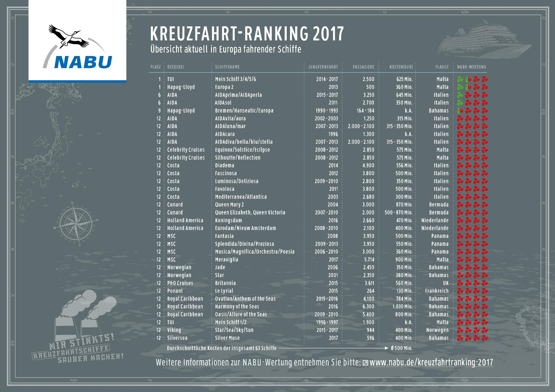 NABU-Bundesgeschäftsführer Leif Miller sagt hierzu: „Die Umweltbilanz der Kreuzfahrtreeder ist insgesamt weiterhin schlecht. Insbesondere Costa, MSC und Royal Caribbean verweigern sich mit ihrer bestehenden Flotte komplett dem Umwelt- und Klimaschutz. Enttäuschend ist auch die Unverfrorenheit, mit der beispielsweise AIDA Cruises medienwirksam Investitionen in Abgassysteme ankündigt, ohne diese dann umzusetzen. Denn auch über ein Jahr nach Indienststellung der neuen Schiffsgeneration ist bei der AIDA Prima kein Abgasfilter im Einsatz.“