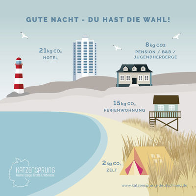 Um auf einen Blick den Zusammenhang zwischen Reiseverhalten und Klima darzustellen, hat das Katzensprung-Team mehrere Grafiken veröffentlicht. Sie zeigen, wie jeder Einzelne mit seiner Entscheidung dazu beitragen kann, die Klimabilanz der Deutschen beim Reisen zu verbessern - zum Beispiel mit der Wahl des Verkehrsmittels, der Unterkunft oder der Ernährung.