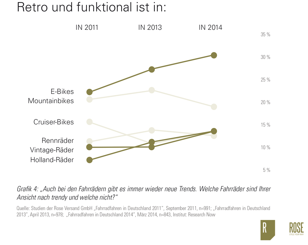 Von wegen hässlich und unmodern. E-Bikes sind groß im Kommen und liegen im Fahrrad-Trend-Check weit vorne. Die Rose Versand GmbH fragte für die Studie "Fahrradfahren in Deutschland 2014" 1.006 Deutsche, welche Räder aktuell im Trend sind. Das Ergebnis: Ein Drittel (31 Prozent) findet E-Bikes total trendy, gefolgt von den Retrovarianten Holland- und Vintage-Rad mit jeweils 14 Prozent. Und auch Sportradler sind schon elektrisiert. Allgemein würden mehr Sportfahrer ein E-Bike nutzen als Alltagsfahrer.