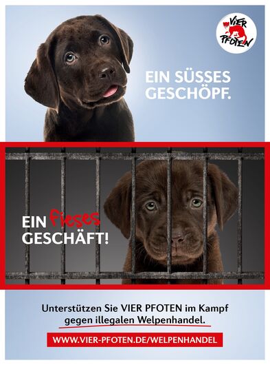 Laut einer Studie der Europäischen Kommission werden jeden Monat rund 50.000 Hunde zwischen den europäischen Ländern gehandelt. Vor allem der Internethandel mit Welpen boomt. Die meisten dieser Tiere sind nicht geimpft und wurden in Welpenfabriken, sogenannten Vermehrerstationen, unter grausamen Bedingungen produziert. Um die Öffentlichkeit über die skrupellosen Geschäfte der Welpenmafia aufzuklären, hat VIER PFOTEN nun die Aufklärungskampagne Süßes Geschöpf – Fieses Geschäft gestartet.